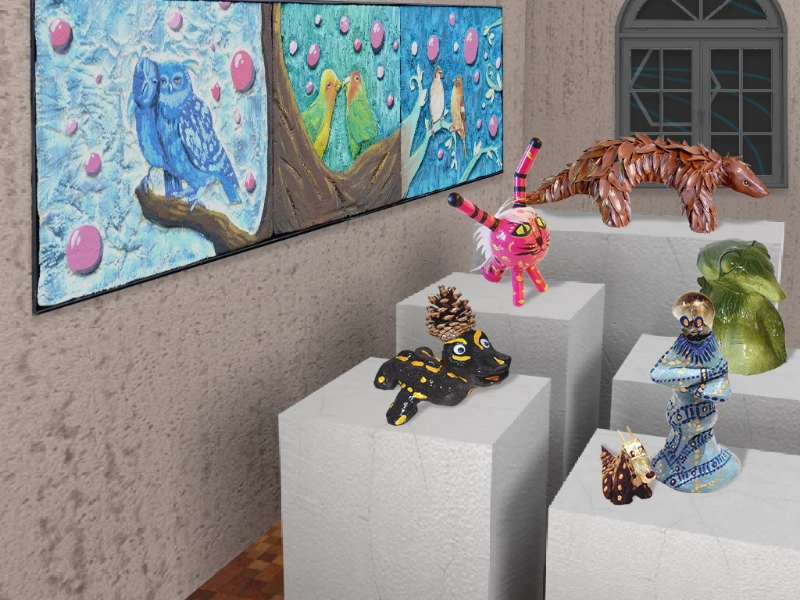 J’explore différents matériaux : peinture, papier mâché, argile, résine, objets recyclés.