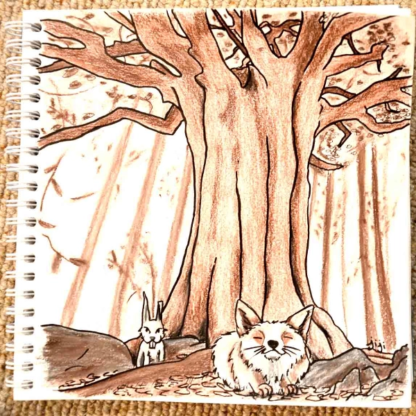 Dessin au crayon de Jillian Monot, Renard et lapin